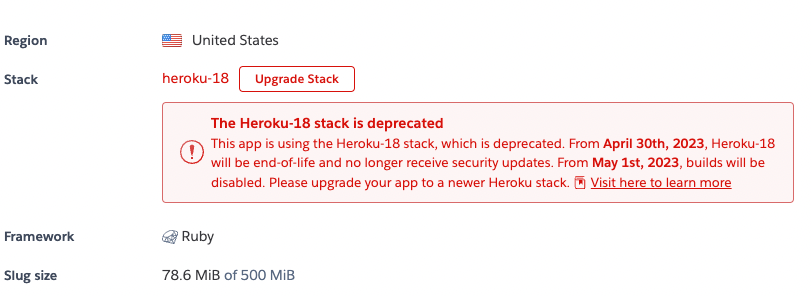 As of May 1st, 2023, Heroku will no longer be supporting the Heroku-18 stack. The reason for this deprecation is to maintain synchronization with the Ubuntu Long Term Support releases. If you are currently running your Rails application on this stack, when you navigate to the Heroku dashboard you will notice a warning to upgrade to either Heroku-20 or Heroku-22 before the end of the Heroku-18 stack life on April 30th, 2023.