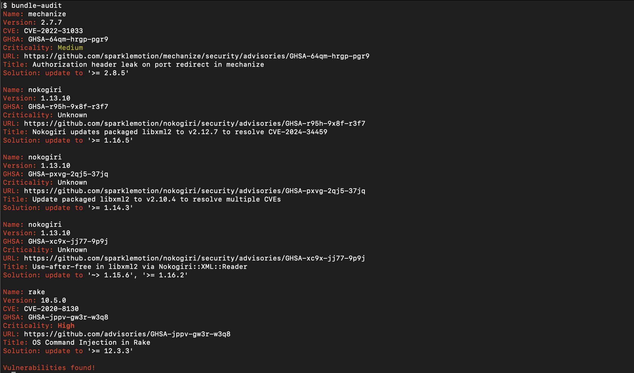 bundler-audit will analyze your Gemfile.lock and compare it against the Ruby Advisory Database mentioned above. It will display a list of any identified vulnerabilities along with their details: