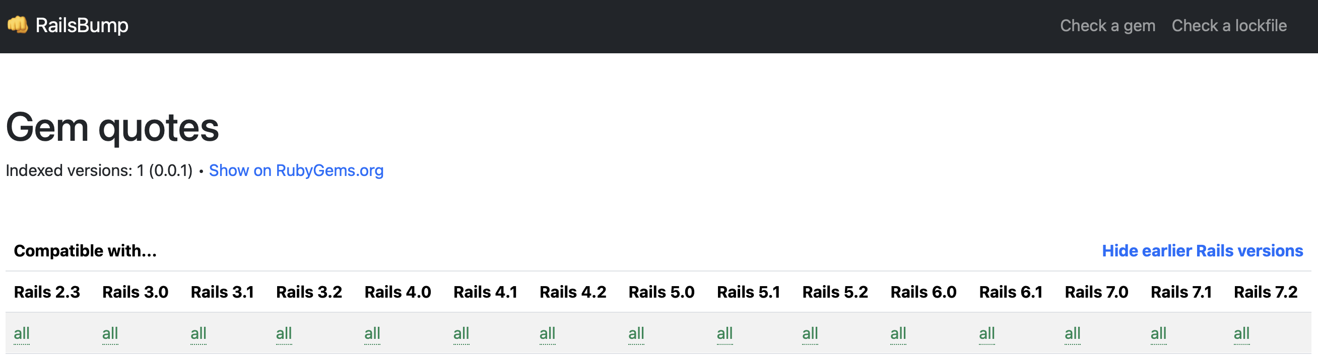 The app is live at RailsBump.org , where you can check an individual gem or a whole Bundler lockfile (Gemfile.lock).